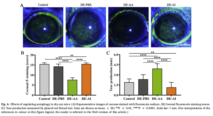 目前,DE的治療方法是使用潤(rùn)滑眼表的人工淚液或減少眼表炎癥的局部抗炎劑。其他治療選擇,包括全身抗炎藥,可用于對(duì)局部滴眼液無(wú)反應(yīng)的患者。自噬通過(guò)影響炎癥細(xì)胞的存活條件和改變細(xì)胞因子的轉(zhuǎn)錄、加工和分泌來(lái)調(diào)節(jié)炎癥。相反,自噬受細(xì)胞因子水平的調(diào)節(jié)。因此,作者評(píng)估了自噬調(diào)節(jié)劑可以緩解與DE相關(guān)的眼表炎癥。