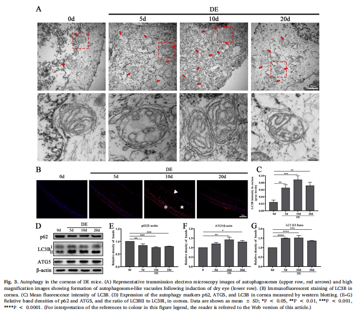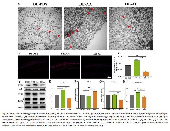 干眼病(DED)是一種多因素的眼表疾病,影響全球數(shù)百萬(wàn)人,其特征是眼表炎癥和損傷。目前尚不清楚角膜自噬是否參與DED中觀察到的眼表炎癥。為了測(cè)試這種參與,干眼(DE)在由容納在一個(gè)可控環(huán)境的雌性C57BL/6小鼠中誘導(dǎo)皮下注射的東莨菪堿.在這些小鼠的角膜中檢測(cè)到自噬相關(guān)蛋白LC3BATG5的表達(dá)和自噬的激活。用自噬激活劑LYN-1604治療減輕了DE小鼠的臨床適應(yīng)癥,包括淚液產(chǎn)生和角膜熒光染色。LYN-1604還降低了角膜炎癥反應(yīng)產(chǎn)物的水平,包括腫瘤壞死因子αTNF-α)和基質(zhì)金屬蛋白酶-3-9。相比之下,用自噬抑制劑3-MA治療DE小鼠會(huì)加劇DE的臨床適應(yīng)癥并增加炎癥反應(yīng)產(chǎn)物的水平。這是第一項(xiàng)表明自噬可以調(diào)節(jié)眼表炎癥水平的研究,表明調(diào)節(jié)自噬的藥物可以緩解眼表炎癥并治療DED。